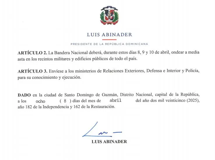 El presidente Luis Abinader declaró mediante 194 – 25 los días 8, 9 y 10 de abril de 2025 de duelo oficial, por motivo de la trágica situación ocurrida en la madrugada de hoy en la discoteca Jet Set, en el Distinto Nacional.