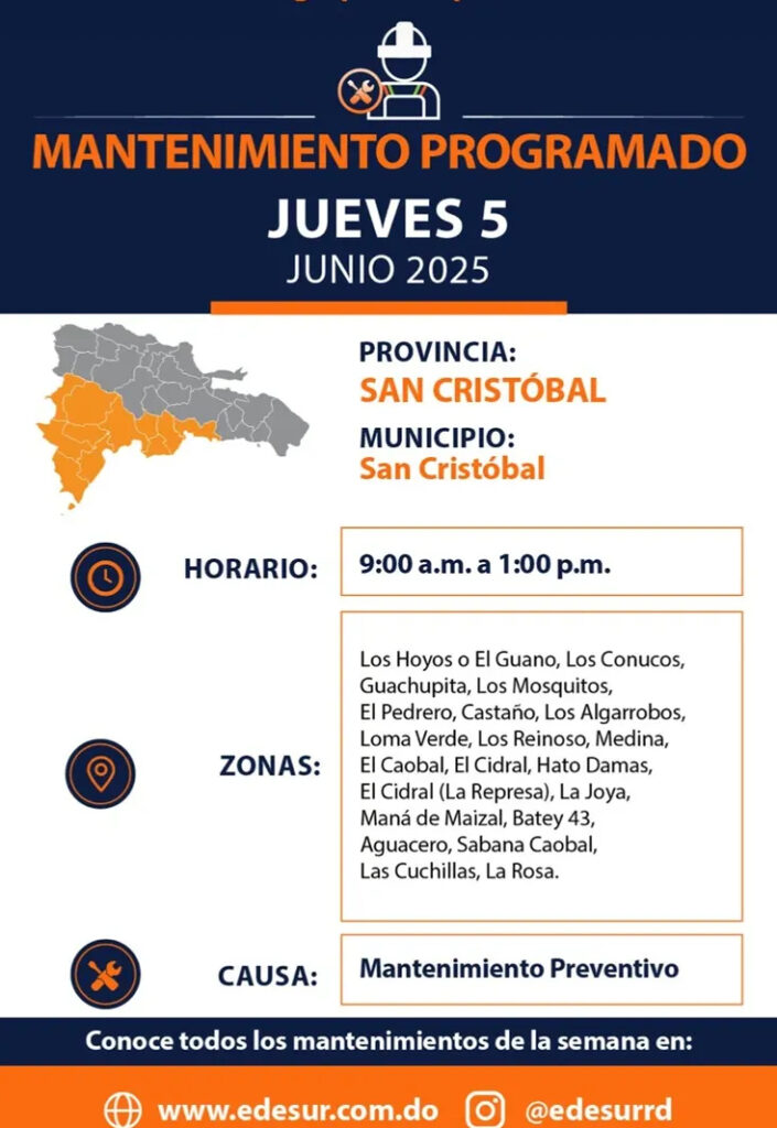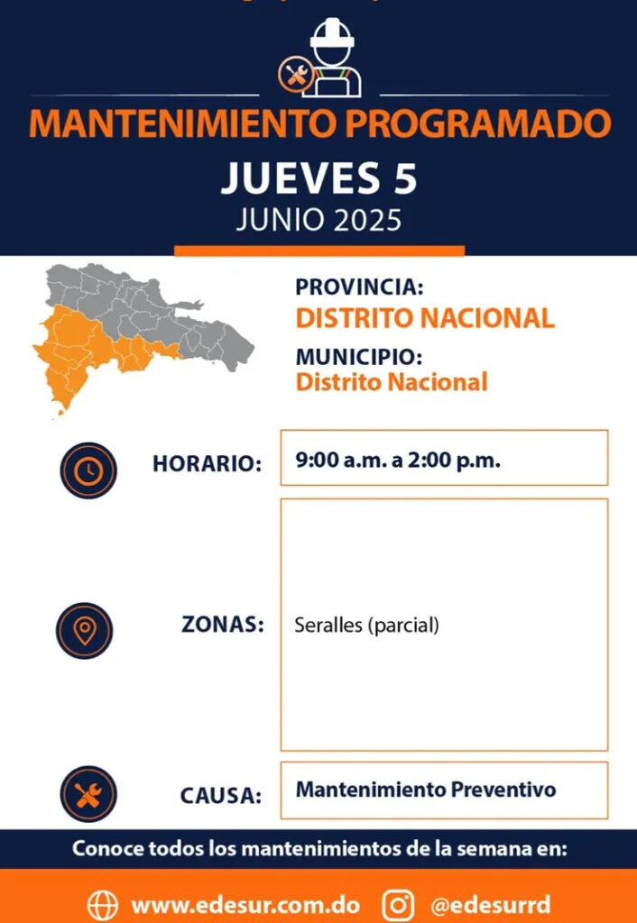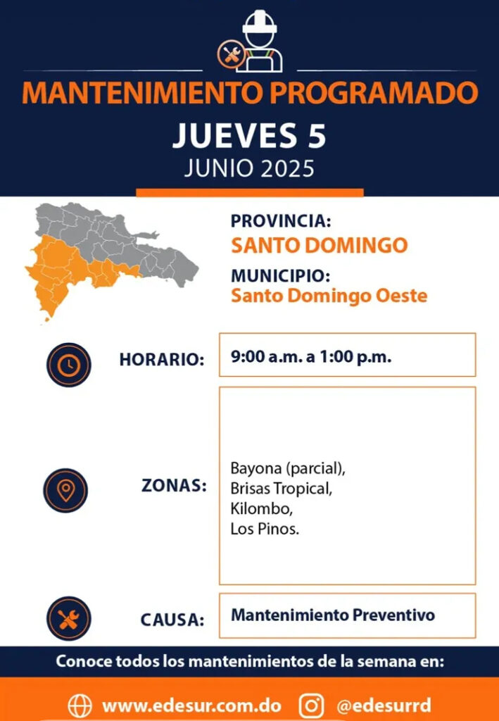 Edesur Dominicana informó que la interrupción del suministro eléctrico en más de 30 zonas del Distrito Nacional, Santo Domingo Oeste y Los Alcarrizos se extenderá este jueves debido a trabajos de mantenimiento en la subestación ubicada en el kilómetro 10½ de la autopista Duarte.