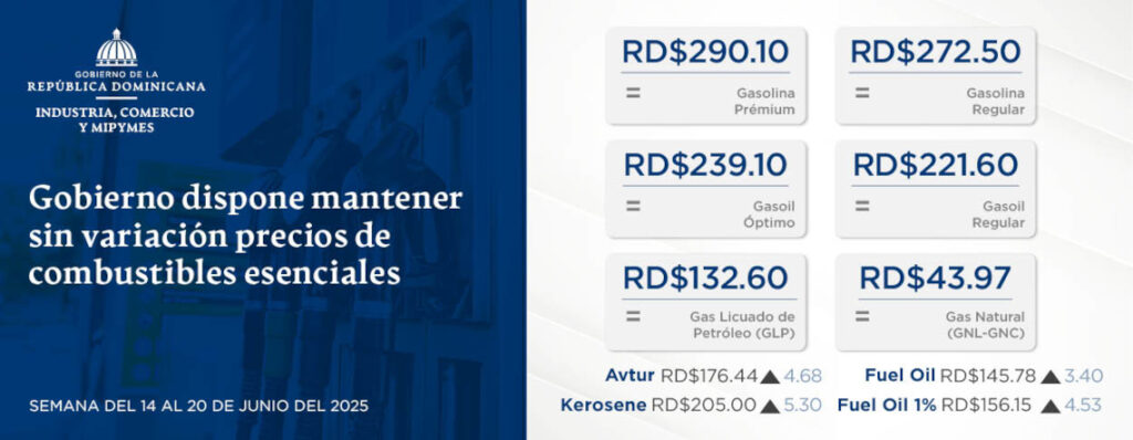 Santo Domingo, D.N, – El viceministro de Comercio Interno del Ministerio de Industria, Comercio y Mipymes (MICM), Ramón Pérez Fermín, informó que, para la semana del 14 al 20 de junio de 2025, el Gobierno dominicano dispuso mantener sin variación los precios de los combustibles esenciales.