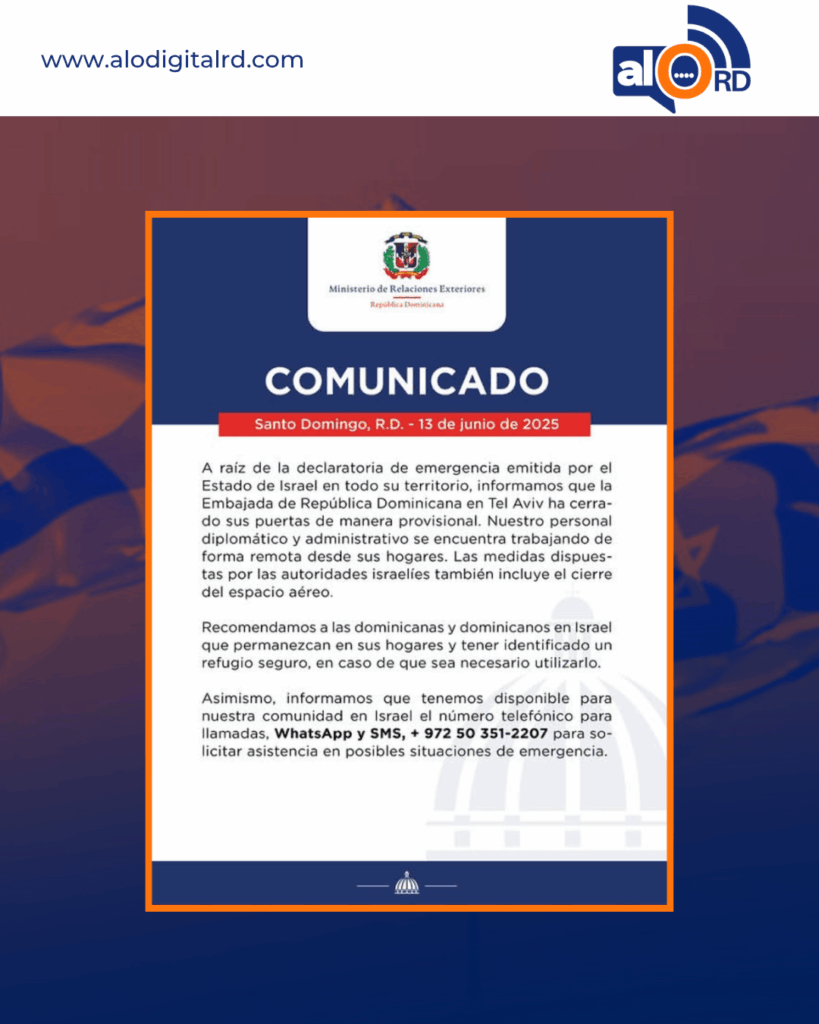 Según un comunicado oficial del Ministerio de Relaciones Exteriores dominicano, el embajador y todo el equipo de la legación están a salvo y continúan trabajando de forma remota desde sus hogares. Además, las autoridades israelíes han cerrado el espacio aéreo, lo que limita la movilidad y las operaciones en la región.