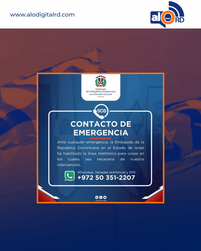 Se recomienda a los ciudadanos dominicanos que se encuentran en Israel que permanezcan en sus residencias y tengan identificado un lugar seguro para refugiarse en caso de emergencia. Para brindar apoyo, la embajada ha habilitado un número de contacto (+972 50 351-2207) disponible para llamadas, mensajes de texto y WhatsApp, con el fin de atender cualquier situación urgente.