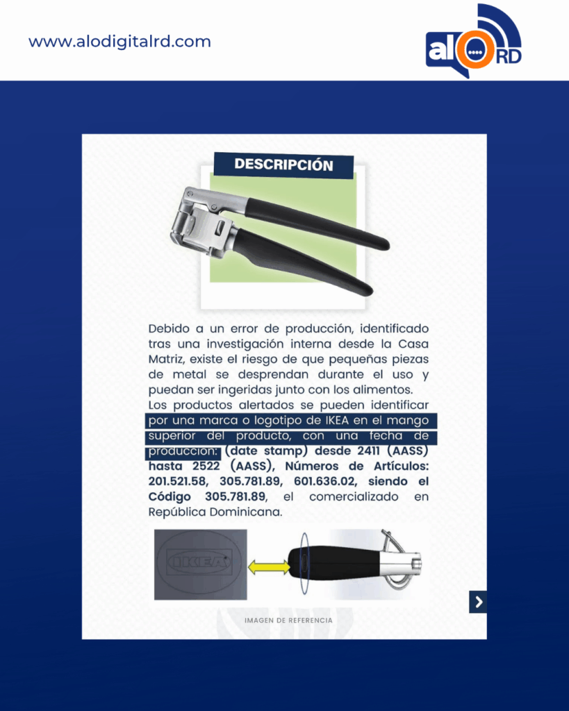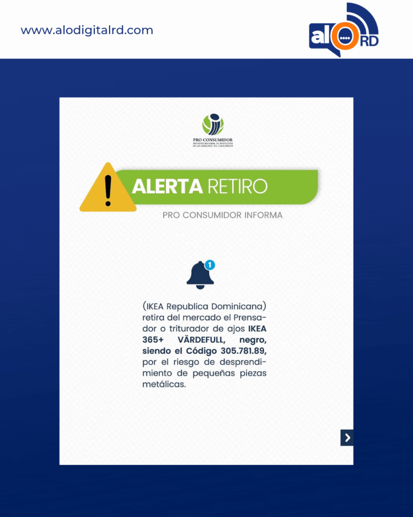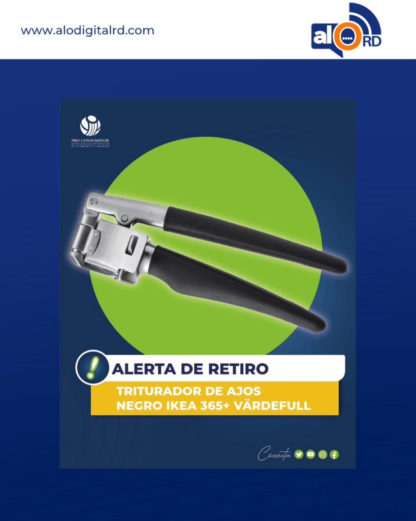 IKEA República Dominicana ha anunciado la retirada del prensador o triturador de ajos modelo IKEA 365+ VARDEFULL (color negro) debido a un posible peligro para los usuarios. Se detectó que algunas unidades podrían liberar pequeñas piezas metálicas, lo que representa un riesgo de ingestión accidental.