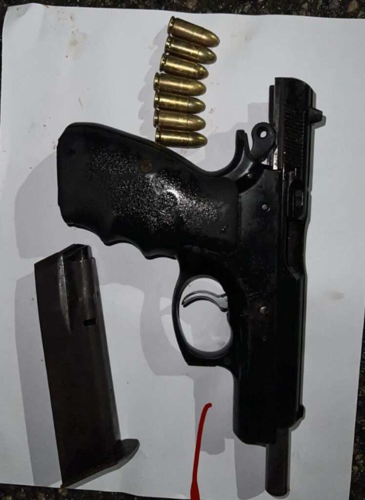 La persecución culminó cuando agentes de la Subdirección Regional Cibao Sur (Bonao) y personal de investigación en Pedro Brand lograron interceptar el vehículo. En ese momento, el agresor disparó contra la patrulla con una pistola marca CZ75B, serie 8063L, que portaba de manera ilegal, viéndose los agentes en la obligación de repeler la agresión.