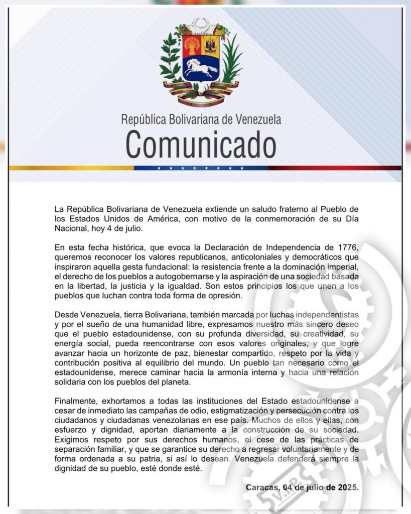 El Gobierno venezolano expresó este viernes un saludo cordial al pueblo de Estados Unidos en ocasión del Día de la Independencia estadounidense. Sin embargo, aprovechó la fecha para demandar el fin inmediato de lo que califica como una “persecución sistemática” contra los migrantes venezolanos en ese país.