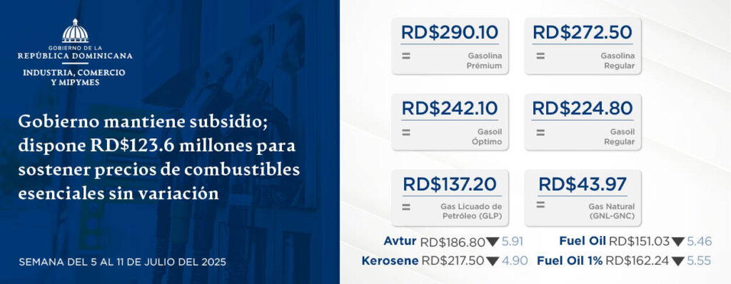 Santo Domingo, D.N.- El Gobierno dominicano continuará protegiendo la economía de los hogares y sectores productivos con la asignación de RD$123.6 millones en subsidios a los combustibles, correspondiente a la semana del 5 al 11 de julio de 2025, así lo informó este viernes el viceministro de Comercio Interno del Ministerio de Industria, Comercio y MIPYMES (MICM), Ramón Pérez Fermín.