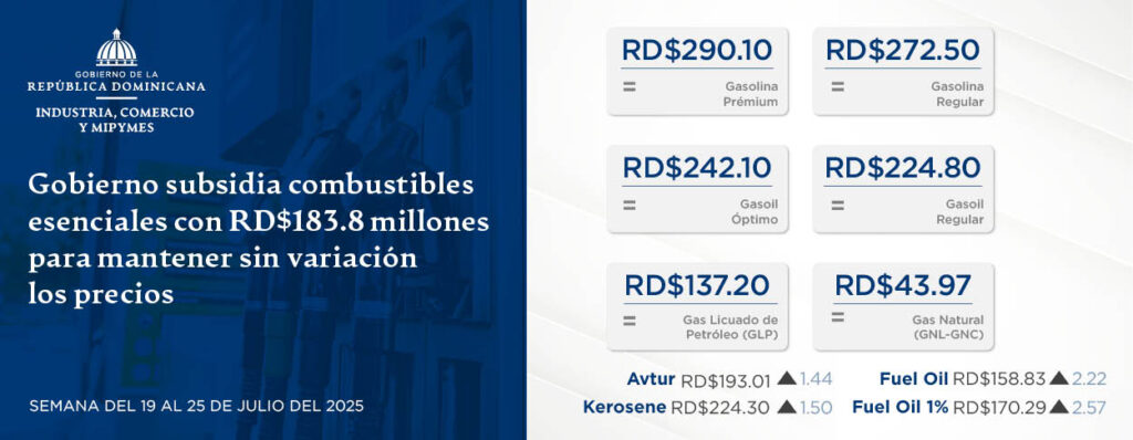 Santo Domingo, D. N.- Para la semana del 19 al 25 de julio de 2025, el Gobierno dominicano destinará RD$183.8 millones en subsidios para mantener sin variación los precios de los combustibles esenciales en los hogares dominicanos y sectores productivos.