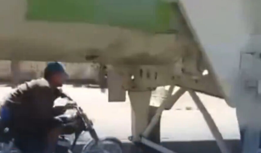 Motorista se juega la vida cruzando carril debajo de camión cisterna