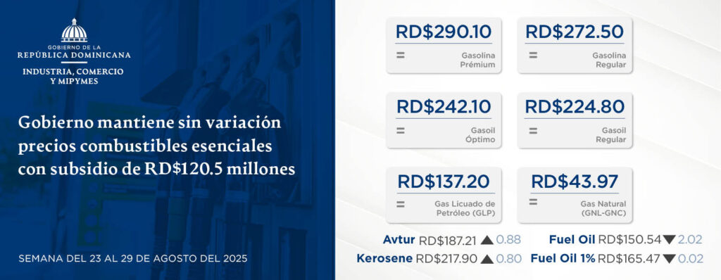 Santo Domingo, D. N.- El viceministro de Comercio Interno del Ministerio de Industria, Comercio y Mipymes (MICM), Ramón Pérez Fermín, informó que, para la semana del 23 al 29 de agosto de 2025, los precios de los combustibles esenciales se mantienen sin variación, debido a la asignación de un subsidio por un monto que asciende a RD$120.5 millones.