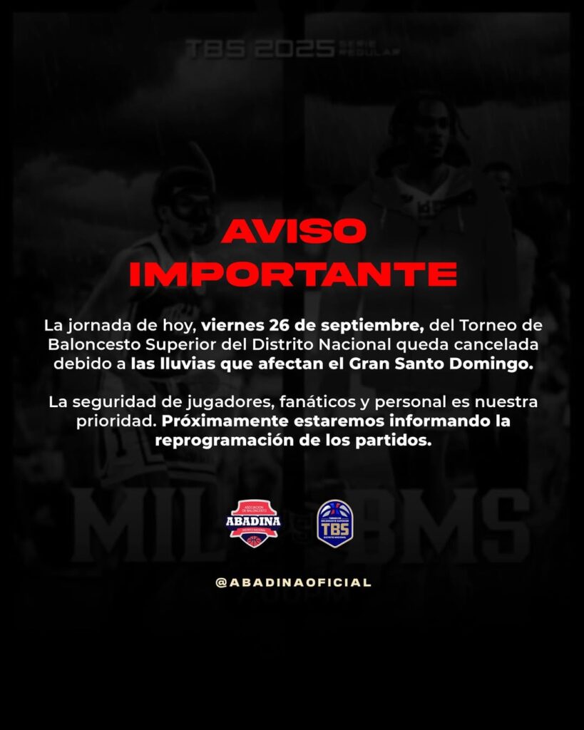 El Comité Organizador del Torneo de Baloncesto Superior del Distrito Nacional (TBS Distrito 2025) anunció la suspensión de la doble jornada pautada para la noche de este viernes 26 de septiembre, debido a las intensas lluvias que afectan gran parte del país. El evento forma parte de la edición número 49 del campeonato.