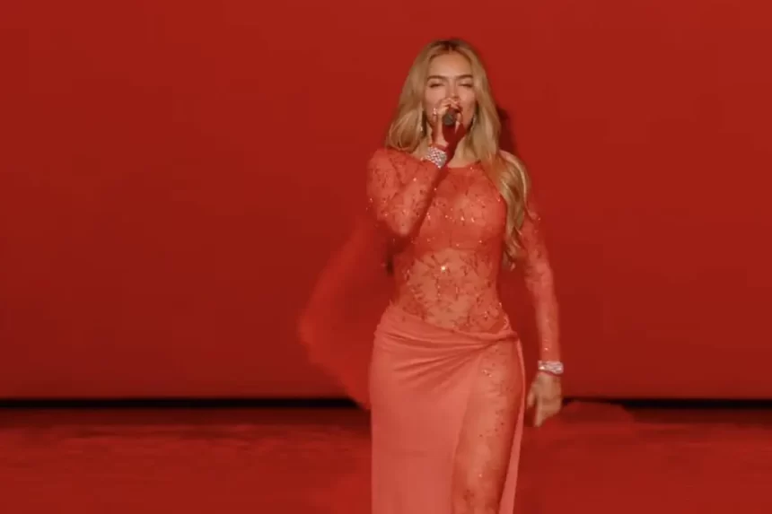 Durante la interpretación, Karol G lució un bodysuit rojo con encaje y piedras, acompañado de una falda satinada y tacones del mismo color. El look, complementado con un brazalete plateado, destacó por su coherencia con la estética del desfile, que celebró la sensualidad femenina y la diversidad cultural.
