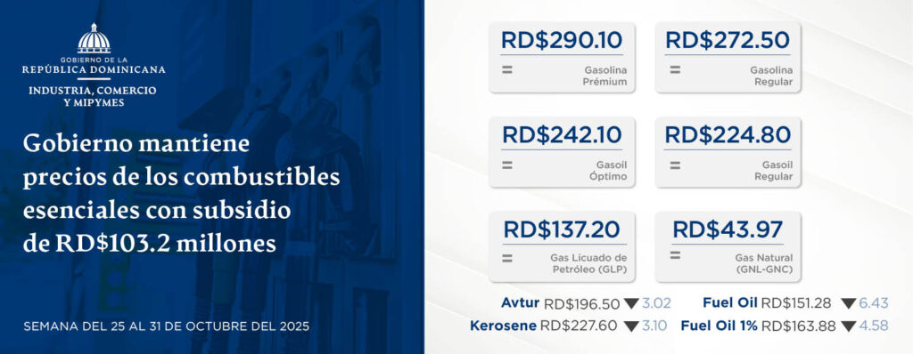 Santo Domingo, D. N. – El viceministro de Comercio Interno del Ministerio de Industria, Comercio y Mipymes (MICM), Ramón Pérez Fermín, informó que, durante la semana del 25 al 31 de octubre de 2025, el Gobierno mantendrá sin variación los precios de los combustibles de mayor consumo, con la asignación de un subsidio ascendente a RD$103.2 millones, para proteger la economía de los hogares y la producción nacional.