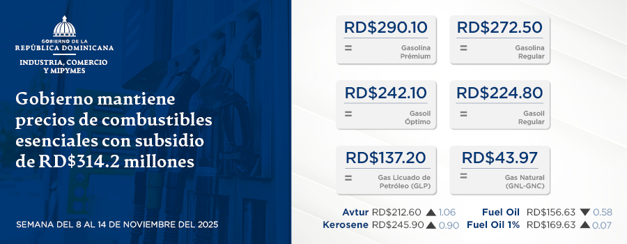 Santo Domingo, D. N.-El viceministro de Comercio Interno del Ministerio de Industria, Comercio y Mipymes (MICM), Ramón Pérez Fermín, informó que el Gobierno asignó un subsidio de RD$314.2 millones para mantener sin variación los precios de los combustibles de mayor consumo, durante la semana del 8 al 14 de noviembre de 2025.