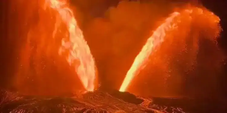 El volcán Kilauea en Hawái volvió a entrar en erupción, lanzando columnas de lava que superaron los 1,500 pies (aproximadamente 460 metros) de altura. Estas impresionantes fuentes de roca fundida formaron una figura que recuerda a unas alas, un fenómeno poco común que ha captado la atención de científicos y visitantes.