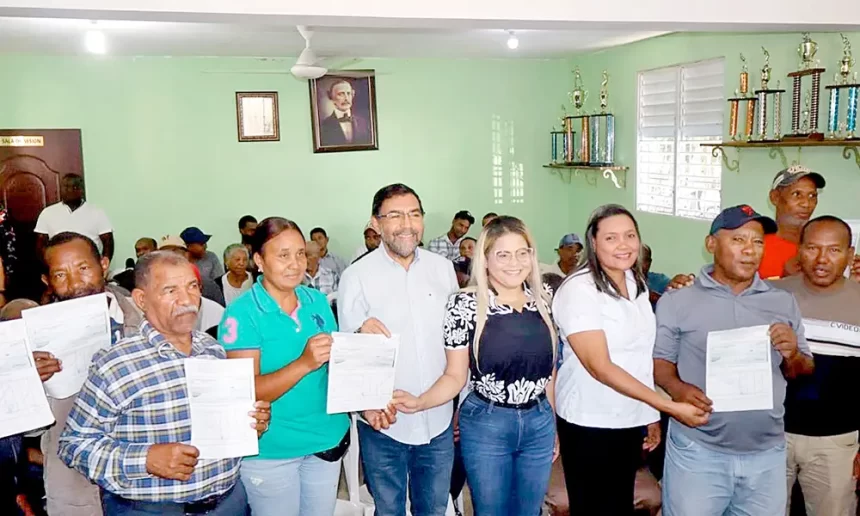 A través del Instituto Nacional de Recursos Hidráulicos (Indrhi), el Gobierno entregó cheques por un monto superior a RD$43 millones a 50 agricultores de esta comunidad de Hato Nuevo Cortes.