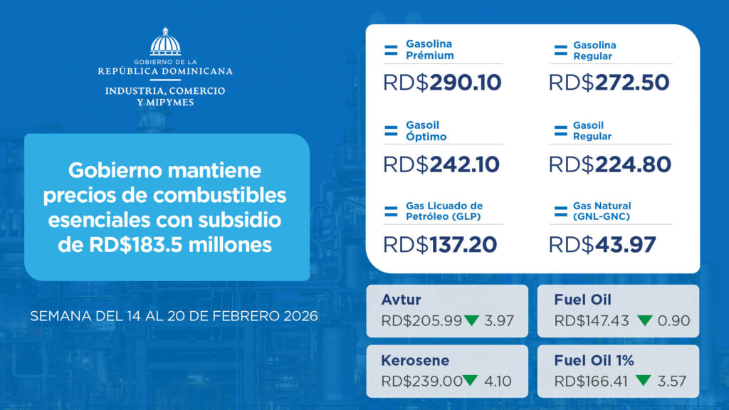 Santo Domingo, D. N.- El Ministerio de Industria, Comercio y Mipymes (MICM) informó que, durante la semana del 14 al 20 de febrero de 2026, el Gobierno mantendrá sin variación los precios de los combustibles esenciales, mediante un subsidio ascendente a RD$183.5 millones.