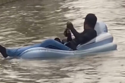 Hombre pide más lluvia, mientras disfruta la lluvia en flotador y con bebida en mano en SDO